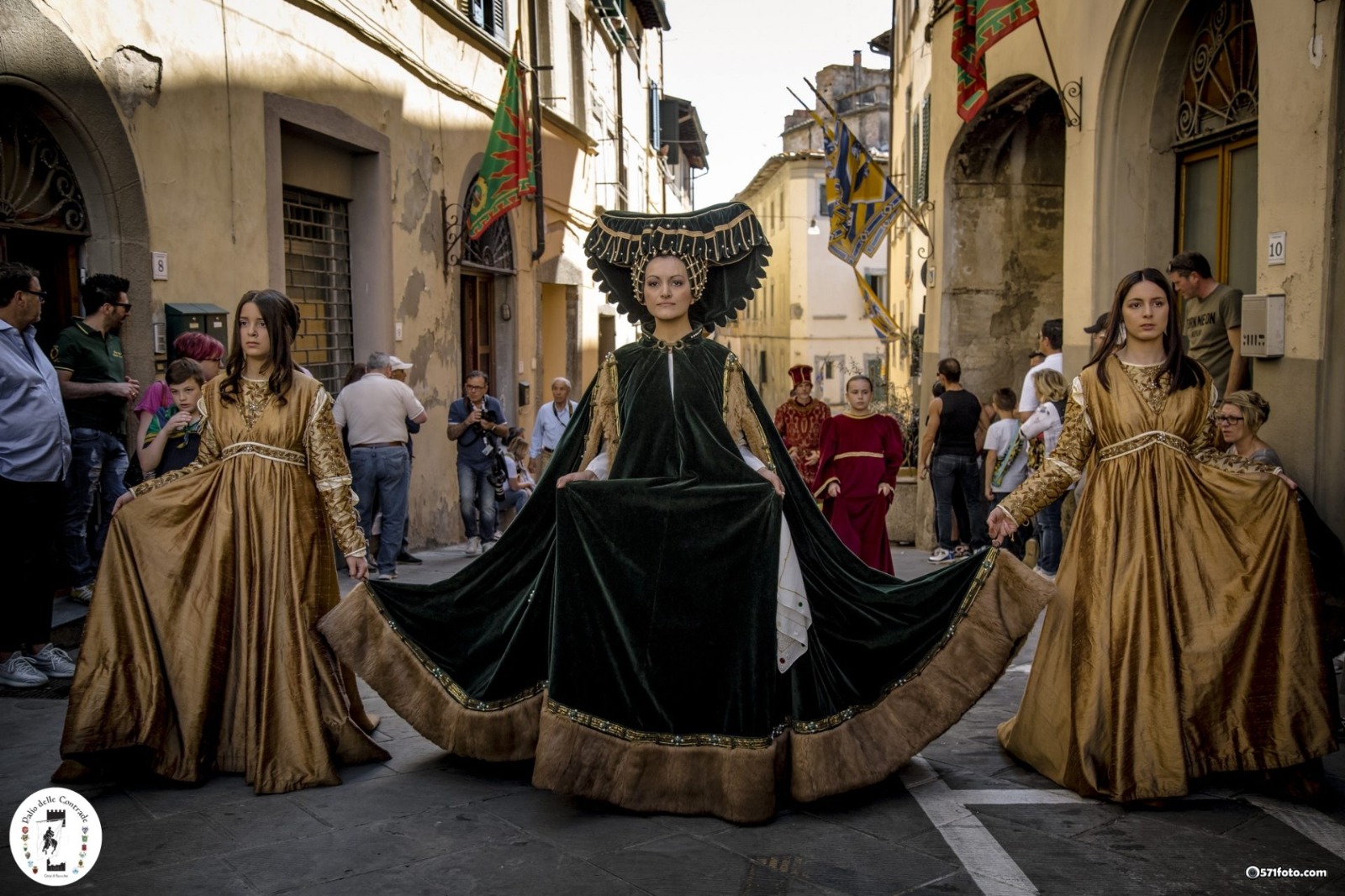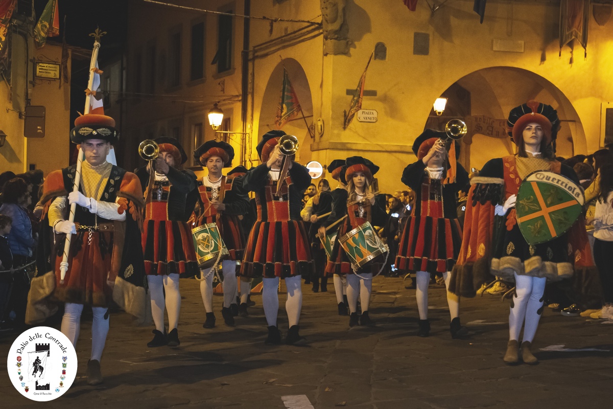 Con circa 1200 figurati in costume, il corteggio storico delle 12 Contrade si snoda lungo le vie e le piazze del centro. Ogni Contrada propone la rievocazione di un momento storico di Fucecchio e il corteo viene chiuso da un gruppo di 12 figuranti, uno per ogni Contrada, che accompagnano il Cencio.