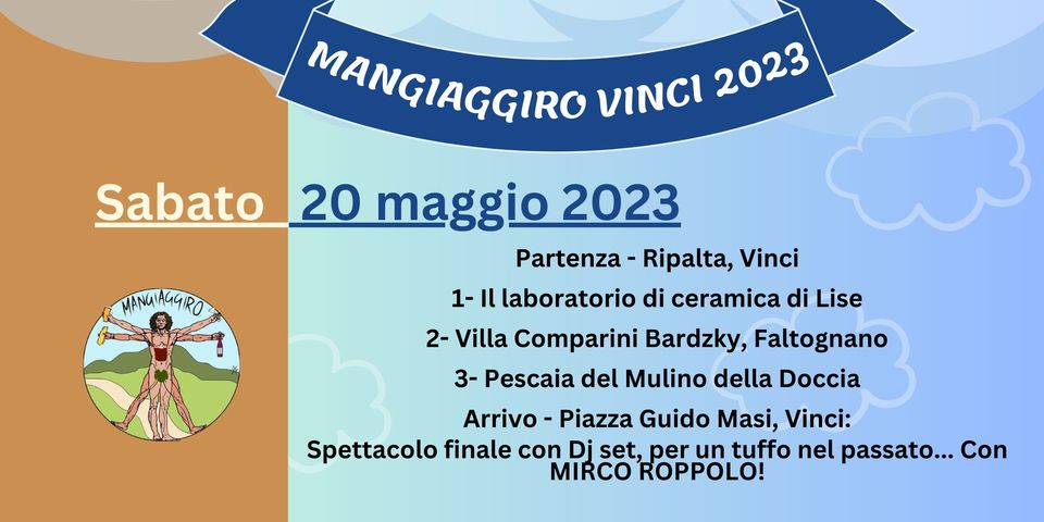 Il 20 Maggio si terrà la Terza edizione di Mangiaggiro, la camminata a tappe per degustare piatti tipici, vini e birre artigianali di qualità, attraversando le vigne e i campi di olivi che caratterizzano il territorio del Montalbano. Il percorso prenderà il via dal Tennis & Padel Club di Vinci, per poi raggiungere l'Azienda Agricola Bianchi Carlo, Casa di Lise, Aia della Villa Comparini a Faltognano, Pescaia della Doccia, e concludersi sotto le mura del Castello dei Conti Guidi in piazza Guido Masi. Grazie al patrocinio del Comune di Vinci sarà possibile visitare il Museo Leonardiano e la Casa Natale di Anchiano usufruendo di una riduzione sul biglietto d'ingresso per tutti coloro che mostreranno il tagliando di partecipazione a Mangiaggiro.