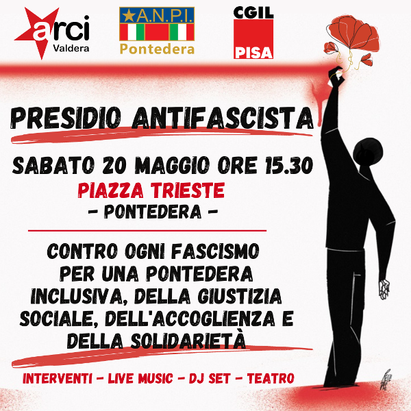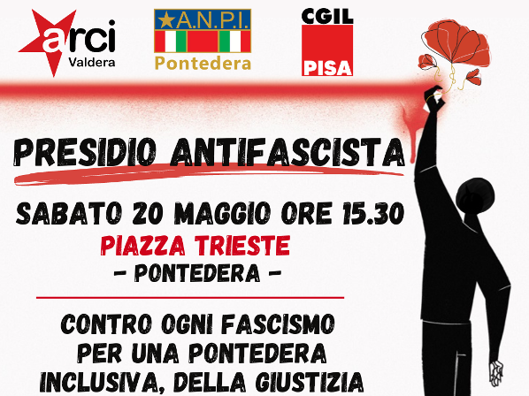 Ecco perché l'Anpi di Pontedera sarà in piazza sabato 20 maggio dalle 15.30 alle 18, con un proprio presidio in piazza Trieste a Pontedera, insieme all'Arci Valdera, alla Cgil e invitando associazioni, realtà sindacali, collettivi studenteschi, partiti, famiglie e semplici cittadini, a scendere in piazza per ribadire il nostro NO ad ogni fascismo.