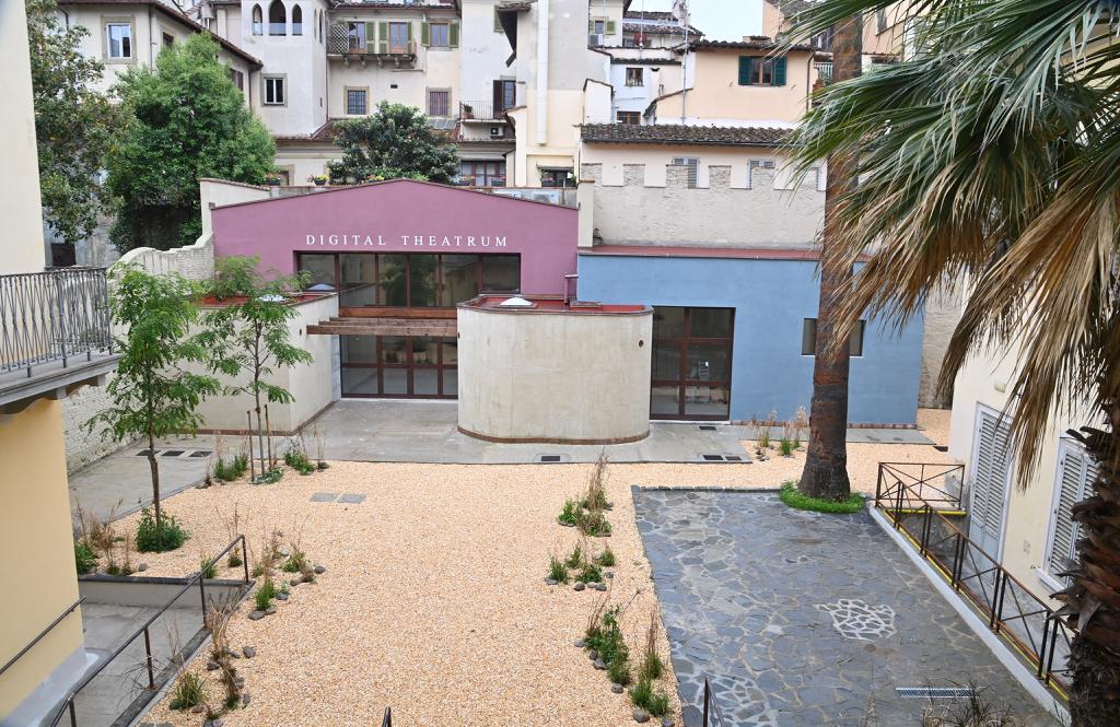 La piazza-giardino copre un’area triplicata rispetto a quella originaria grazie all’abbattimento degli oltre 300 mq di baracche realizzati negli anni 50, mentre nei locali della ex scena nascerà il ‘digital teatrum’: un luogo fisico attrezzato con strumentazioni digitali per consentire a cittadini e visitatori di sperimentare direttamente le arti digitali senza la mediazione di uno schermo. Al centro del complesso si trova ora il giardino, visibile dalla porta esterna per invogliare cittadini e visitatori ad affacciarsi all’interno e scoprire il teatro rinato. Anche i colori sulla parte alta della facciata, ottanio e malva, sono stati pensati per lanciare un segnale visivo tra i merli di cinta e le mura finalmente riportati alla luce. Tutto l’edificato originario, infatti, è stato recuperato con un’operazione di demolizione delle strutture fatiscenti in muratura che nel corso dei decenni avevano quasi interamente coperto la struttura del teatro con pedane, sottotetti, soppalchi e divisioni interne.
