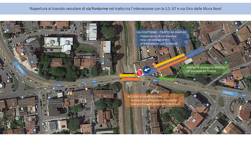 A partire da lunedì 22 maggio 2023, sarà riaperta al traffico, a doppio senso di circolazione, via Pontorme, nel tratto compreso fra la Statale 67 e via Giro delle Mura nord. Il tratto di strada era chiuso al traffico per permettere il completamento della posa dei sottoservizi relativa al cantiere del nuovo ponte sul torrente Orme. Il provvedimento è contenuto nell'ordinanza 294 del 18 maggio 2023 (https://bit.ly/3OlxcSk) che dispone anche, all'intersezione fra via Pontorme e la Statale 67, istituzione della segnaletica verticale e orizzontale permanente di 'Stop' e 'Obbligo di proseguire diritto' (direzione centro Empoli) per i veicoli che provengono da via Pontorme e si immettono sulla Statale.Resta da completare, a causa delle condizioni meteo avverse registrate negli ultimi giorni, l'intervento relativo alla riduzione della rumorosità dei giunti dell'infrastruttura: sarà concluso appena si registreranno condizioni metereologiche adeguate