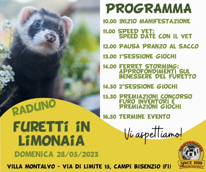 Furettomania torna nella sua location più tradizionale: la Limonaia di Villa Montalvo a Campi Bisenzio in provincia di Firenze. Il raduno dell’associazione nazionale che si occupa dell’informazione e della tutela del furetto su tutto il territorio italiano plana in Toscana domenica 28 maggio con apertura delle porte alle ore 10. In arrivo da tutte le regioni appassionati e proprietari di questi mustelidi per una giornata da trascorrere tutti insieme con diverse novità. Un appuntamento che, chiaramente, è anche rivolto a tutto il pubblico che intende scoprire questo animale in modo più approfondito e puntuale. I volontari e i veterinari saranno a disposizione di tutti per colloqui e semplici curiosità. Ci sarà, inoltre, la possibilità di fare il primo passo verso una possibile futura adozione.