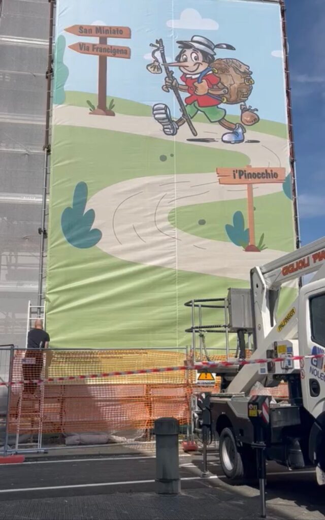 Un Pinocchio "pellegrino" sul maxi cartellone della nuova ciclopedonale di San Miniato