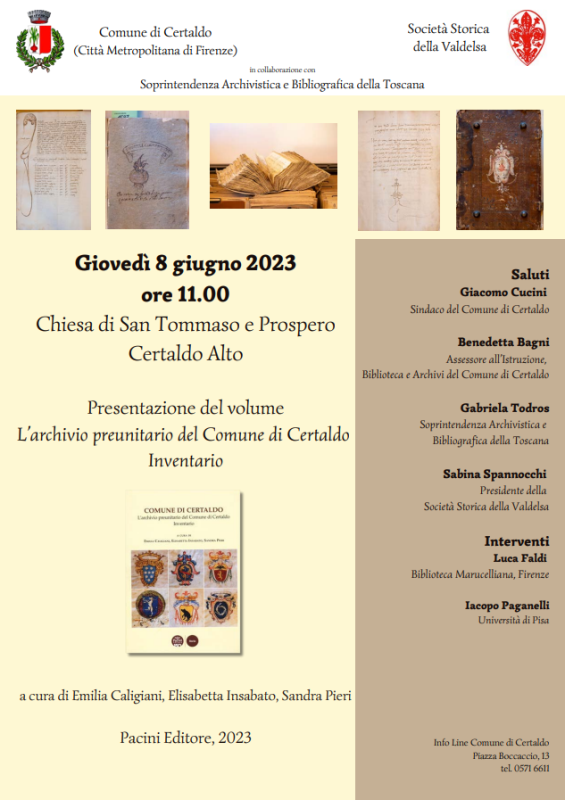 All'evento di presentazione del volume (Pacini Editore 2023) saranno presenti il sindaco di Certaldo Giacomo Cucini, l'assessora all'istruzione biblioteca e archivi Benedetta Bagni, Gabriela Todros per la Soprintendenza Archivistica e Bibliografica della Toscana e Sabina Spannocchi, presidente della Società Storica della Valdelsa. Interverranno Luca Faldi della Biblioteca Marucelliana di Firenze e Iacopo Paganelli dell'Università di Pisa.
