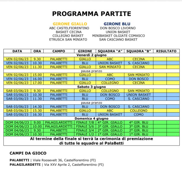 Per i tifosi castellani occhi puntati, naturalmente, sull’ABC che disputerà la prima gara d’esordio contro il Cecina (venerdì ore 9.30 al PalaBetti), per poi incontrare il San Miniato nel pomeriggio (ore 15) e il Collegno il sabato (ore 15.30). Domenica matina (4 giugno) si svolgeranno le finali: quelle per il 7° e il 5° posto al Pala Gilardetti (via XXV Aprile), e quelle per il 1° e 3° posto al Pala Betti.