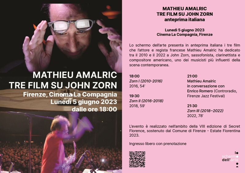 Al via dal Cinema la Compagnia, con un'anteprima italiana dello Schermo dell'arte che ospita l'attore e regista francese Mathieu Amalric, pluripremiato ai Cesar come attore, miglior regista al Festival di Cannes per il film Tournée, ha girato tre film dedicati a John Zorn, sassofonista, clarinettista e compositore americano, tra i più influenti e geniali musicisti della scena contemporanea. Amalric incontra Zorn nel 2008 e inizia a seguirlo e filmarlo in ogni occasione possibile, cogliendo con grande sensibilità il suo processo creativo. Ideati per essere proiettati durante i concerti di Zorn, i tre film saranno presentati in questa occasione alla presenza del regista e per la prima volta in Italia nella loro sequenza temporale (5 giugno dalle ore 18, prenotazione obbligatoria).