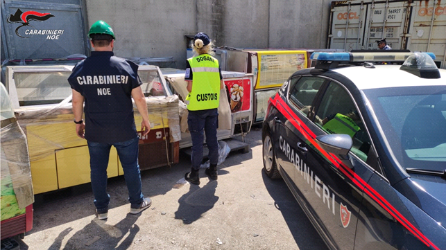 Sequestrato un carico di 8 tonnellate di rifiuti speciali, pericolosi e non, destinati in Iraq, dai carabinieri assieme all'Agenzia Dogante e Monopoli con il Nucleo Operativo Ecologico. Il carico, dichiarato all’esportazione da una ditta individuale avente sede nelle Marche, è costituito da 61 apparecchiature frigo ed una lavatrice usati.