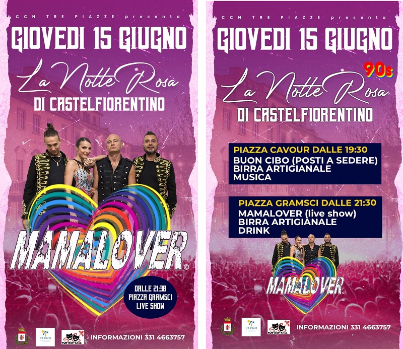 Giovedì sera il centro di Castelfiorentino si anima con “Notte Rosa” e i negozi aperti. Questo il titolo dell’iniziativa promossa dal CCN “Tre Piazze” in collaborazione con Contrad’Arte e il patrocinio del Comune che contempla uno spettacolo musicale, cibo e animazione itinerante nelle principali vie e piazze del centro storico basso.Avvio alle 19.30 in Piazza Cavour con cibo, birra e vari cocktail, da assaporare comodamente seduti al chiaro di luna, con intrattenimento a cura degli attori di Contrad’Arte che si esibiranno anche lungo le vie del centro. Alle 21.30 la festa si sposterà quindi in Piazza Gramsci dove ci saranno alcuni stand di dolci, cocktail e birra e uno spettacolo dancing anni ’90 che vedrà sul palco i Mamalover.