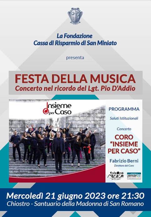 La Fondazione Cassa di Risparmio di San Miniato è lieta di presentare l’evento "Festa della Musica – Concerto nel ricordo del Lgt. Pio D’Addio", che avrà luogo mercoledì 21 giugno 2023 alle ore 21:30 nel chiostro del Santuario della Madonna di San Romano (PI); il concerto sarà tenuto dal coro "Insieme per caso", diretto dal M° Fabrizio Berni.
