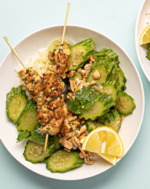 tagliate il pollo a cubetti piccoli e metteteli in una ciotola con l’aglio, il coriandolo tritati finemente e tutti gli altri ingredienti. Mescolate bene, coprite con la pellicola e fate marinare per qualche ora o per una notte in frigorifero. Infilate i cubetti di pollo su degli spiedini di legno e tenete da parte. Lavate e tagliate a fette non troppo sottili. Affettate i bulbi di cipollotto e uniteli alle zucchine in un wok o padella antiaderente. Condite con un filo di olio, sale, pepe e fate saltare per 7-8 minuti in modo che le verdure restino ancora abbastanza croccanti. Fate bollire un pentola di acqua con poco sale e fate cuocere il riso per 12 minuti circa; scolate e tenete da parte. Ungete con un filo d’olio una padella piuttosto grande e fate cuocere gli spiedini di pollo per qualche minuto su ciascun lato finché non saranno ben dorati da tutti i lati. Servite il riso con po’ di zucchine croccanti e gli spiedini di pollo, completate con le arachidi tritate grossolanamente, degli spicchi di limone da spremere al momento, una spolverata di peperoncino, qualche foglia di prezzemolo e un filo d’olio.