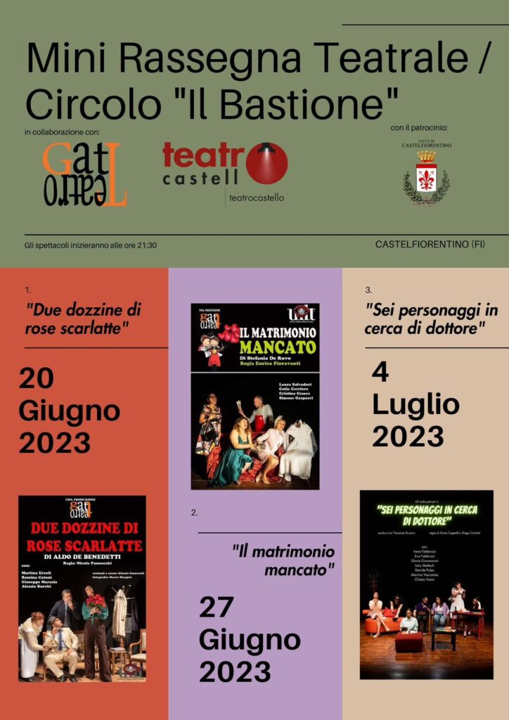 Gli altri due spettacoli sono in programma martedì 27 giugno con “Il Matrimonio mancato” (sempre a cura del Gat) e martedì 4 luglio, con “Sei personaggi in cerca di dottore”, interpretata dagli “Indisciplinati” di TeatroCastello.