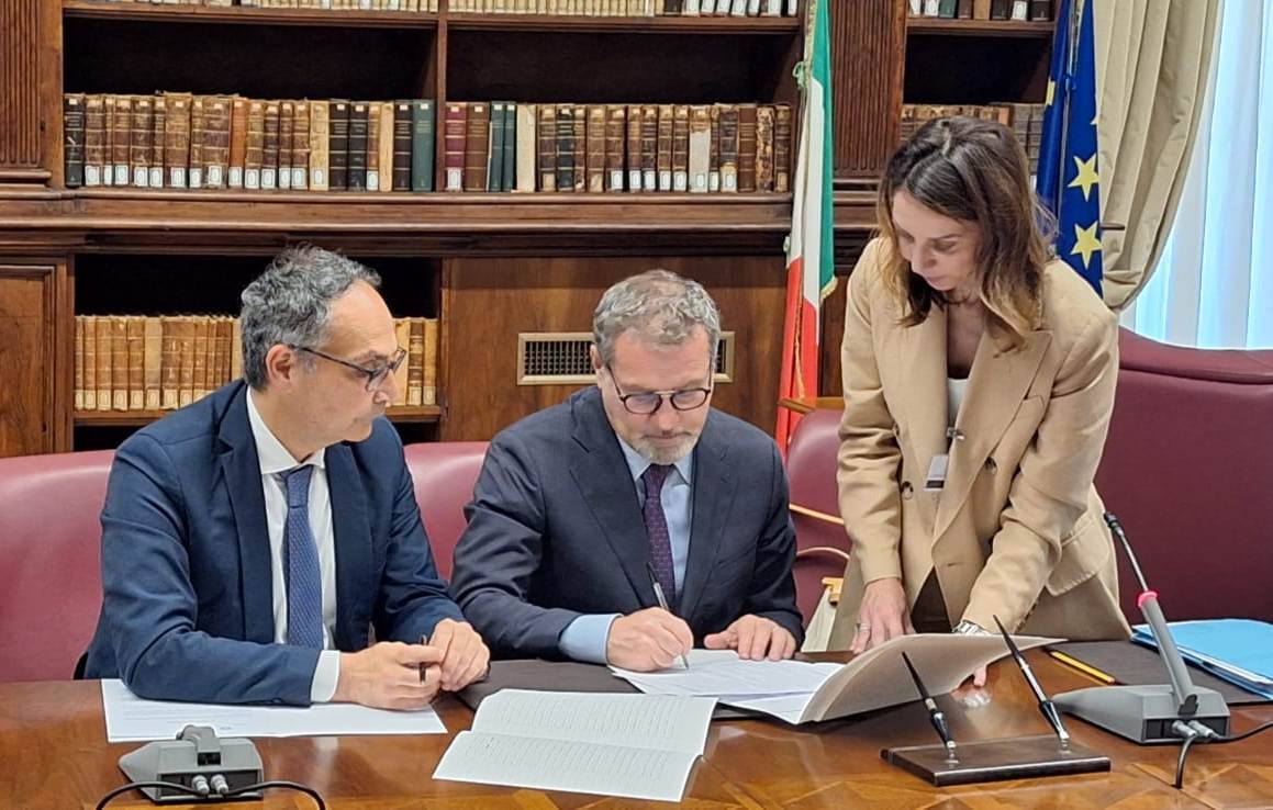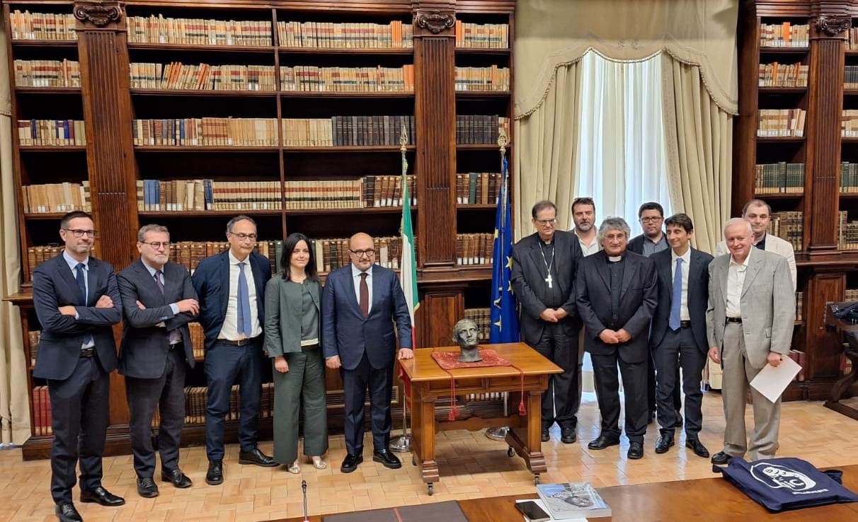 Si è concluso poco fa l’incontro, iniziato alle ore 13, a Roma, al Ministero della cultura (via del Collegio Romano, 27 - Salone del Ministro), dove è stato firmato il rogito del Palazzo dell’Arcipretura di San Casciano dei Bagni (Si), acquistato dallo Stato per destinarlo a sede del museo archeologico che ospiterà i bronzi e gli altri reperti provenienti dallo scavo del Bagno Grande e dalle ricognizioni archeologiche del territorio. Erano presenti, tra gli altri, il Ministro della cultura, Gennaro Sangiuliano, il card. Augusto Paolo Lojudice, vescovo di Montepulciano-Chiusi-Pienza, il Segretario generale del Ministero, Mario Turetta, il Direttore generale Archeologia, Belle Arti e Paesaggio, Luigi La Rocca e il Direttore generale Musei, Massimo Osanna, oltre alla Sindaca di San Casciano dei Bagni, Agnese Carletti.