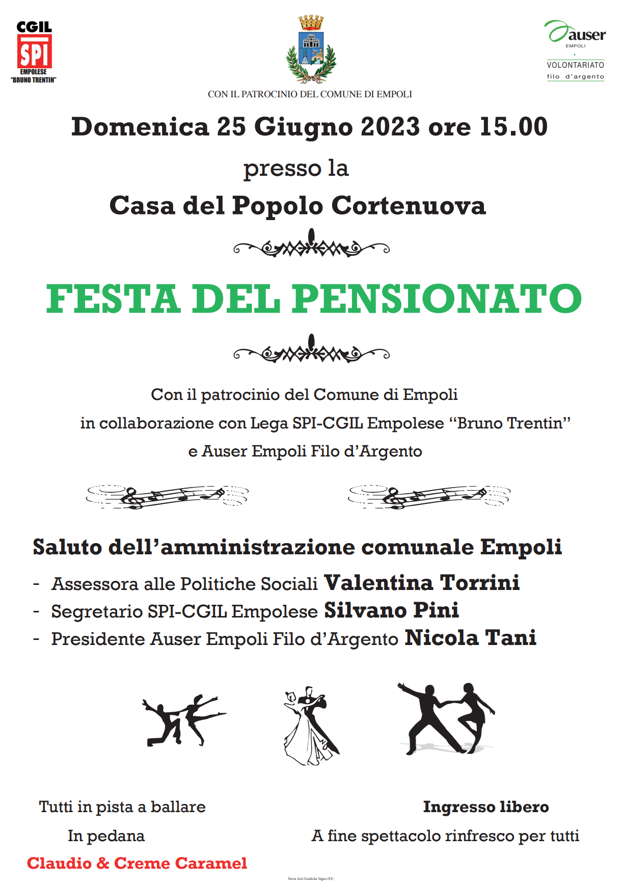 Domenica 25 giugno, al circolo Arci di Cortenuova, presso la Sala Mimosa, si terrà la tradizionale festa del pensionato, ballo liscio con orchestra dal vivo. Con il patrocinio del comune di Empoli e il saluto dell'assessora al sociale Valentina Torrini.
