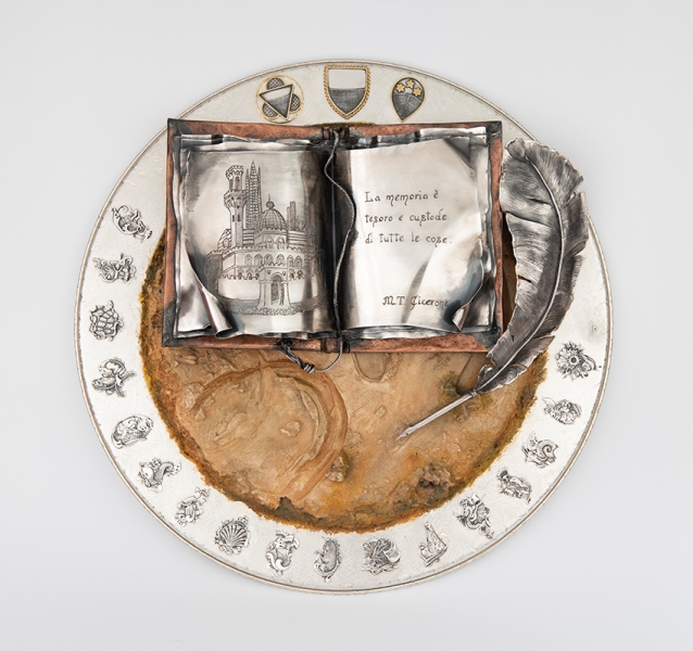 E, proprio a simboleggiare l’importanza di non dimenticare, in primo piano, da una base in terracotta, emerge un libro dalla copertina in rame e le pagine in argento. Su quella di destra una citazione di Cicerone: la memoria è tesoro e custode di tutte le cose, mentre sull’altra una rappresentazione della città ripresa dall’affresco di Sano di Pietro, presente nella Sala delle Lupe a Palazzo Pubblico, eseguito nel 1446 e raffigurante San Pietro Alessandrino, tra i beati Ambrogio Sansedoni e Andrea Gallerani, che regge Siena. Accanto al volume una penna d’oca, così da rimarcare la rilevanza della scrittura e dei suoi custodi: gli archivisti.
