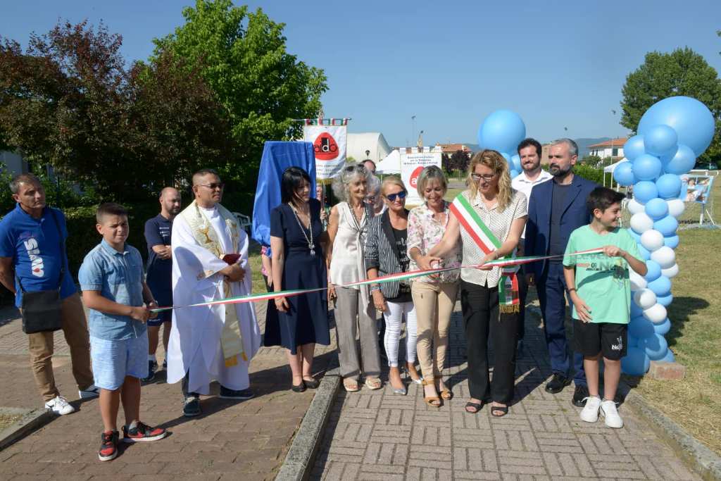 Dopo il taglio del nastro, sono stati tolti i veli alla dedica riportata su una mattonella in ceramica realizzata dall’artista Maurizio Saporito. E’ seguita la benedizione di Don Crisostomo, parroco di Stabbia. Sulla mattonella compare, oltre al logo del Comune di Cerreto Guidi, quello dell’AIDO che nell’occasione era rappresentata dal vicepresidente regionale Alessandro Agnelli che ha ribadito l’importanza della donazione come gesto d’amore e di speranza.