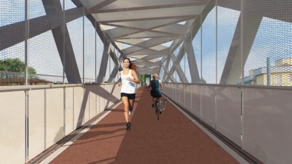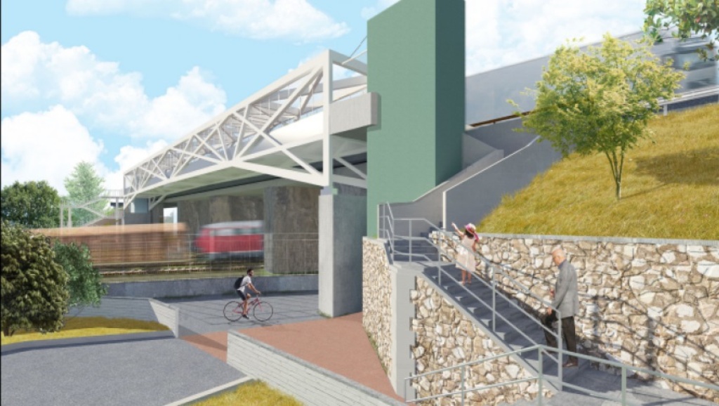 La passerella, costituita in profilati tubolari in acciaio, sarà aperta nella parte superiore e chiusa lateralmente mediante pannelli di lamiera con la finalità di proteggere la sede ferroviaria dalla caduta di oggetti. La pavimentazione della passerella sarà in conglomerato drenante, ecocompatibile, incombustibile e antisdrucciolo. I vani ascensore saranno realizzati in cemento armato a faccia vista, con pensilina leggera di protezione agli ingressi. La scala di accesso sud sarà realizzata mediante profilati in acciaio zincati. La scala nord sarà in parte su terra, in parte a soletta rampante, sarà rivestita in lastre di pietra. In corrispondenza dell’accesso nord, sotto la scala, è previsto un vano parzialmente aperto per l’alloggio dei quadri elettrici e ascensore, dotato di un soppalco in acciaio e lamiera per l’accesso alla manutenzione dei tiranti. E’ prevista inoltre una illuminazione del percorso ciclopedonale, sia dell’interno che dall’esterno.