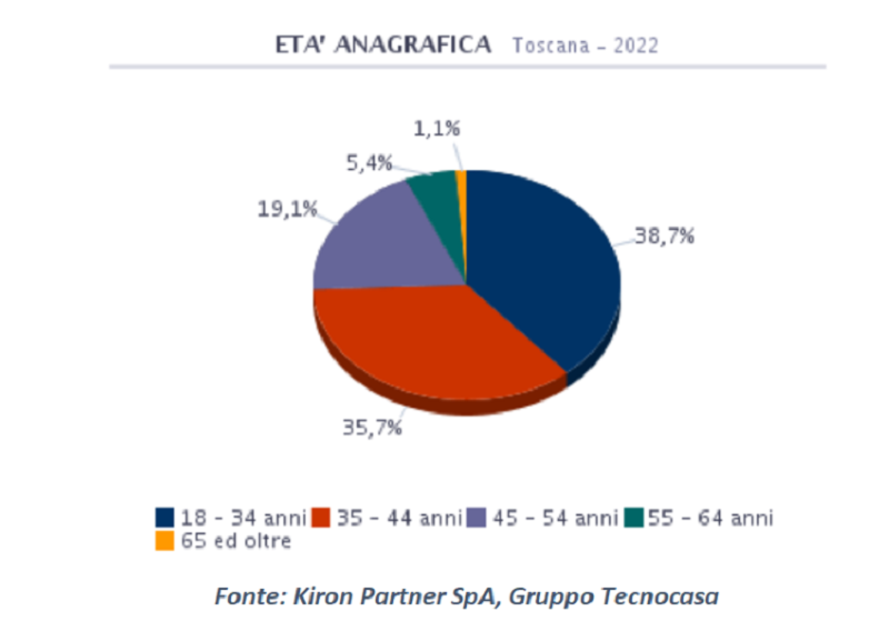 L’età media di chi ha sottoscritto un mutuo in Toscana nel 2022 è 38,4 anni. L’analisi per fasce d’età mostra che il 38,7% della popolazione ricade nella fascia più bassa, 18 - 34 anni; il 35,7% ha un'età compresa tra 35 e 44 anni; il 19,1% ricade nei 45 - 54 anni; il 5,4% si colloca nella fascia 55 - 64 anni; l'1,1% ricade nella fascia più alta, 65 ed oltre.