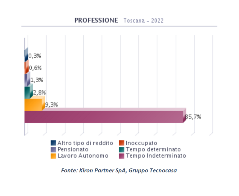 Dall’analisi della professione del mutuatario emerge che la sicurezza economica è tra gli elementi fondamentali richiesti dagli istituti di credito per erogare un finanziamento. Tale caratteristica identifica l'87,0% del campione (dipendenti a tempo indeterminato e pensionati), a fronte del 9,3% di chi ha un contratto di lavoro flessibile (liberi professionisti/lavoratori autonomi e titolari d’azienda) e del 2,8% di lavoratori a tempo determinato.