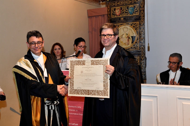 Si è tenuta oggi, alla Certosa di Pontignano dell’Università di Siena, la cerimonia per il conferimento della Laurea magistrale ad honorem in Artificial Intelligence and Automation Engineering al Professor Yann LeCun, Vice President e Chief AI Scientist presso Meta e Premio Turing 2018, riconosciuto come uno degli scienziati più influenti nel campo dell'intelligenza artificiale. LeCun è professore della New York University, ricercatore in Intelligenza Artificiale, machine learning e robotica. Ha ricevuto l’ACM Turing Award del 2018, riconoscimento che viene considerato il “Premio Nobel dell’Informatica”, per le scoperte concettuali e ingegneristiche sulle reti neurali profonde.