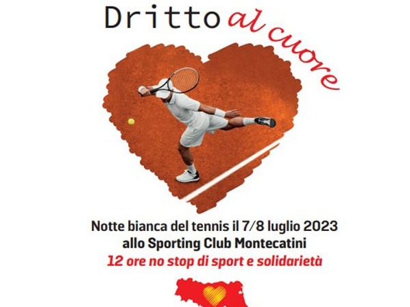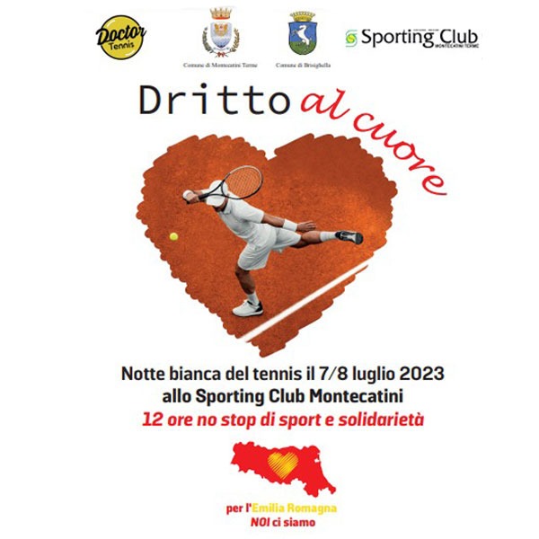 Si chiama: “Dritto al cuore. Per l’Emilia Romagna, noi ci siamo” ed è una notte bianca del tennis, 12 ore no-stop di sport e solidarietà sui campi dello Sporting Club Montecatini. Con l’obiettivo di raccogliere fondi per aiutare un circolo di tennis, il Tc Tre Colli di Brisighella, che ha subito danni ingentissimi a seguito dell'alluvione. Ricalcando quanto già attuato nel 2012, quando lo Sporting Club con una 24 ore di tennis e solidarietà raccolse una somma ingente che fu destinata ai circoli tennis di Finale Emilia e San Felice sul Panaro, gravemente danneggiati da un devastante terremoto, nella notte a cavallo tra il 7 e l’8 luglio prossimi si svolgerà una manifestazione analoga, sviluppata nelle 12 ore, fortemente voluta dal presidente Oriano Corsellini e dai soci del circolo di via Ponte dei Bari per trasmettere uno spontaneo segno di vicinanza e amicizia a una struttura analoga con sede in Emilia Romagna.