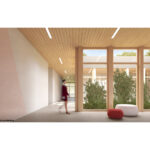 Il rapporto tra interno ed esterno è fluido, grazie alle ampie vetrate e ai lucernari che permettono alla luce naturale di illuminare ogni ambiente. In centro al nuovo edificio è presente il grande atrio che collega le due ali della scuola, immaginato come spazio polifunzionale: destinato a dare il benvenuto ai piccoli allievi, potrà essere utilizzato negli orari di chiusura del nido anche come Civic-center a disposizione della comunità locale, contribuendo a promuovere momenti di interazione e di scambio all’interno di Manifattura.