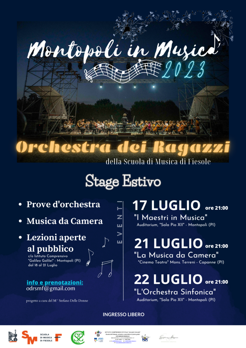L'Orchestra dei Ragazzi della Scuola di Musica di Fiesole a Montopoli in Val d’Arno per il loro stage estivo. Un campus che conferma il grande legame che la cittadina del Cuoio ha con la musica. «Grazie alla collaborazione del professore di violino del nostro Istituto Galileo Galilei di Montopoli e fondatore dell'Associazione Artistica Musicale "Note di Talento" di Milano, Stefano Delle Donne – commentano il sindaco Giovanni Capecchi e l’assessora all’istruzione e alla cultura Cristina Scali – quest’anno ospiteremo nel nostro Comune lo stage estivo dell’orchestra, un’iniziativa che dà lustro al territorio. Quando abbiamo ricevuto la proposta siamo stati da subito molto felici di poter offrire il nostro supporto logistico e di mettere a disposizione i locali della scuola per le prove di una bella realtà come l’Orchestra di Fiesole. Un’occasione per tutta la comunità perché durante lo stage, dal 17 al 22 luglio, ci saranno prove e concerti aperti a tutti».