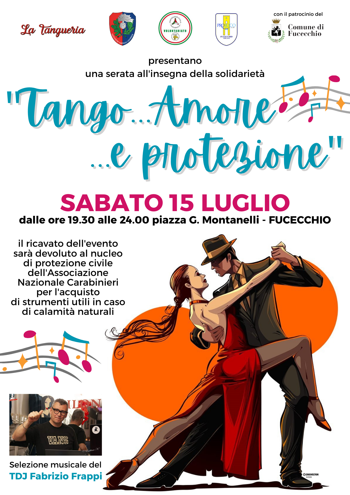 La magia del tango argentino in una notte di spettacolo dedicata alla solidarietà. Un binomio che può sembrare bizzarro, quello tra tango e sicurezza, ma che in realtà non lo è, e che anzi si accinge a portare all'attenzione della comunità un tema sempre più all'ordine del giorno. Sabato 15 luglio, a partire dalle 19.30, darà vita ad una festa in piazza Montanelli all'insegna della solidarietà. Il Nucleo di Volontariato e Protezione Civile dell'Associazione Nazionale Carabinieri, in collaborazione con la Pro Loco di Fucecchio e con il patrocinio del Comune di Fucecchio, organizza infatti una serata a cura dell'associazione La Tangueria, con selezione musicale del dj Fabrizio Frappi. Il tango avrà dunque una missione sociale poichè il ricavato dell'iniziativa, ad ingresso libero, sarà devoluto al Nucleo di Protezione civile per l'acquisto di strumenti utili in caso di calamità naturali.
