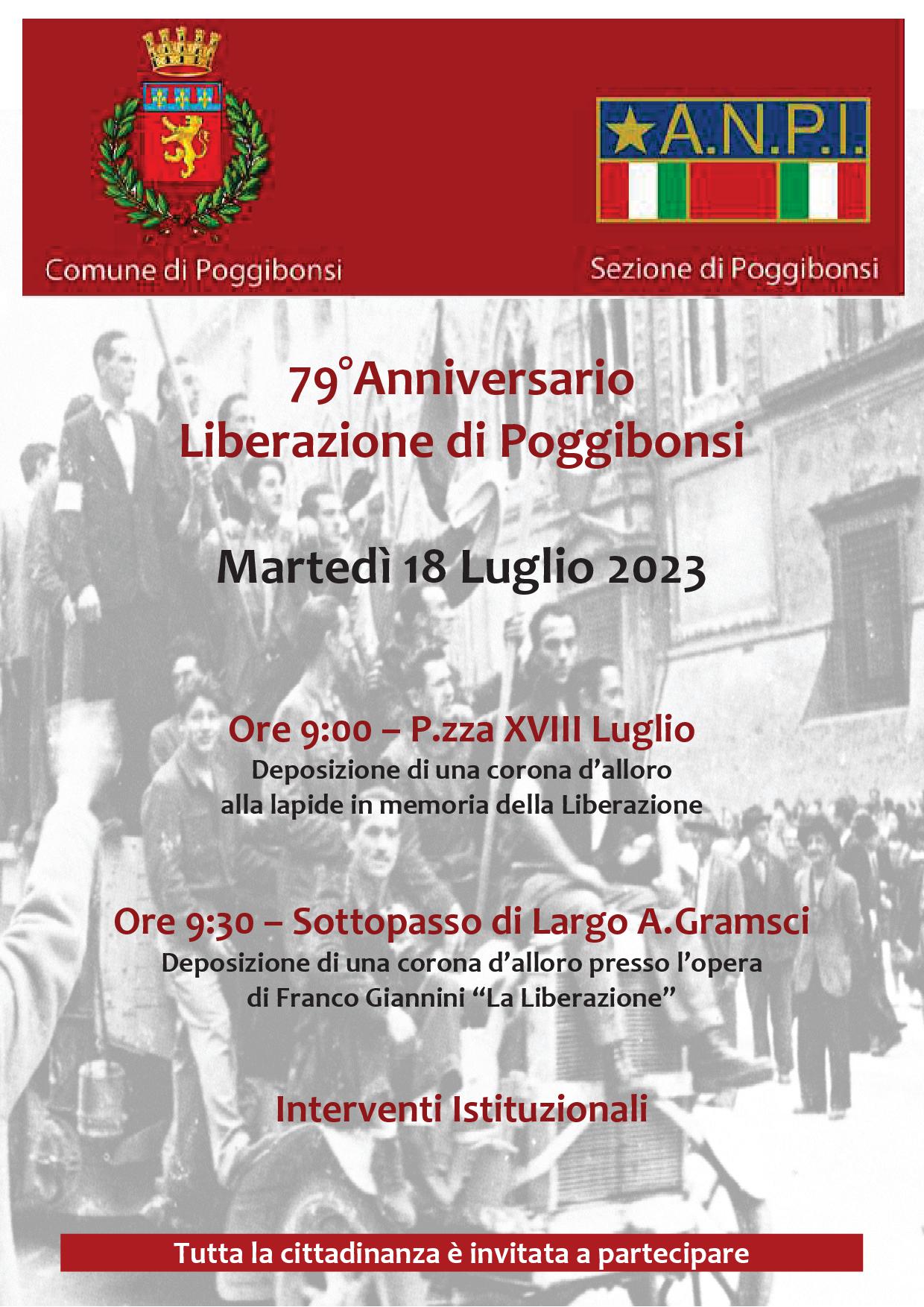 Poggibonsi celebra il 79° anniversario della Liberazione dal nazifascismo avvenuta il 18 luglio del 1944. Domani, martedì 18 luglio, alla presenza del sindaco David Bussagli, si svolgeranno le celebrazioni ufficiali promosse con la collaborazione dell’Anpi di Poggibonsi. Per ricordare l’anniversario saranno deposte le corone d’alloro alla lapide in memoria della Liberazione in piazza XVIII luglio (alle 9) e al sottopasso di largo Gramsci all'opera di Franco Giannini "La Liberazione" (alle 9,30).