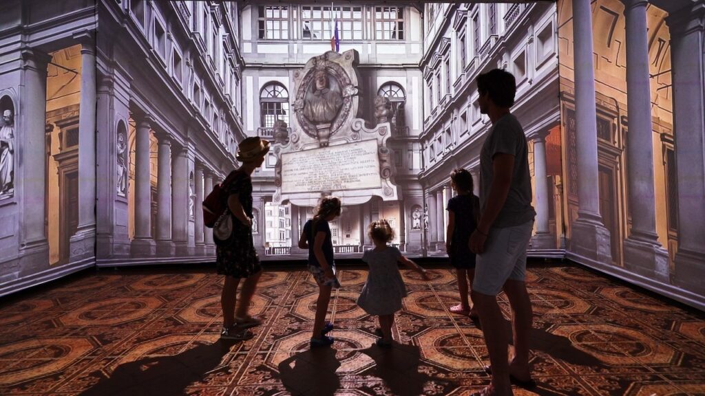 Nei suggestivi ambienti della storica biblioteca Rilliana è invece allestita la mostra immersiva. Il visitatore viene coinvolto dalle proiezioni in alta definizione - su pareti e pavimento – di una serie di opere dal fascino straordinario, con la possibilità di scoprire particolari normalmente non visibili. Capolavori legati indissolubilmente agli Uffizi, come il Tondo Doni di Michelangelo, la Madonna del Cardellino di Raffaello, l’Annunciazione di Leonardo o la Medusa di Caravaggio, possono essere ammirati in alta definizione e con suggestive animazioni che ricreano idealmente il “museo delle opere salvate” presente a Poppi negli anni del conflitto. Diventa così possibile dialogare e interagire con le opere: l’installazione Mirror Room con il suo sistema di specchi da la sensazione di “entrare” nelle casse ricoverate nel castello durante la guerra, ritrovandosi dunque faccia a faccia con i capolavori del celebre museo fiorentino.