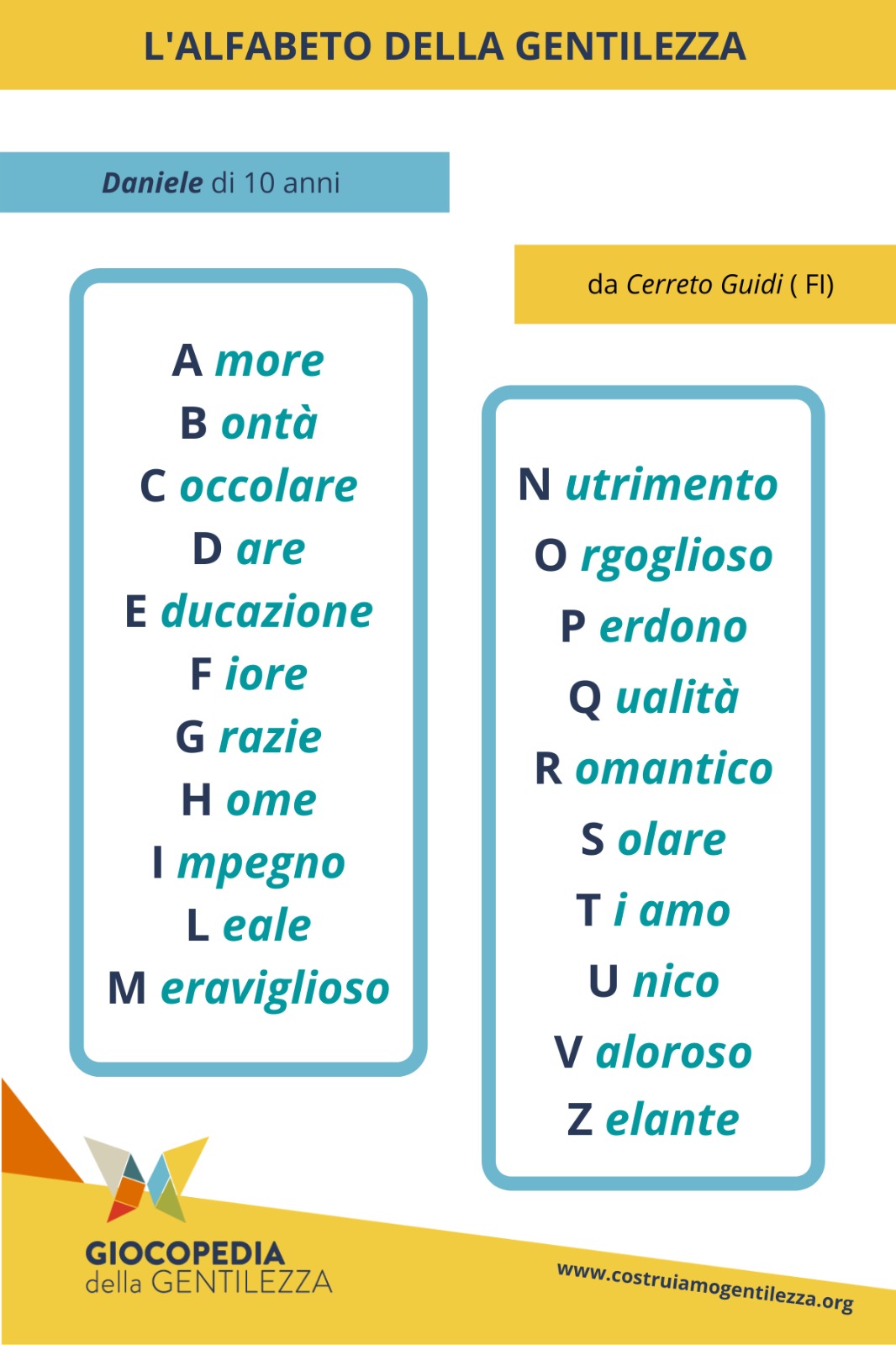 Il primo bambino che ha compilato il suo alfabeto della gentilezza, Daniele di Cerreto Guidi, in provincia di Firenze, lo ha dedicato alla nonna: " Voglio bene alla nonna- scrisse- e le regalo il mio alfabeto della gentilezza perché non è sempre è gentile, soprattutto in macchina quando mi porta a scuola".