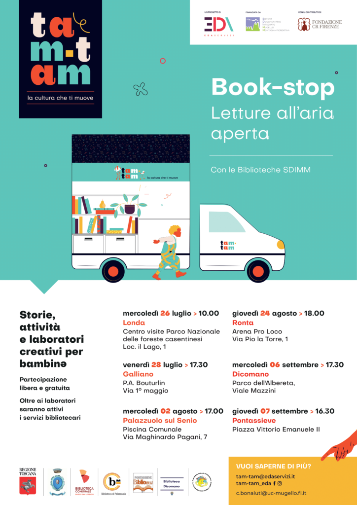 La lettura non va in vacanza e grazie alla collaborazione fra lo SDIMM (Sistema Documentario Integrato Mugello Montagna fiorentina) e la Soc. coop. EDA Servizi, questa estate sarà piena di storie, attività e laboratori all'aria aperta in compagnia del furgone TAM TAM e di bravissime operatrici e bibliotecarie.
