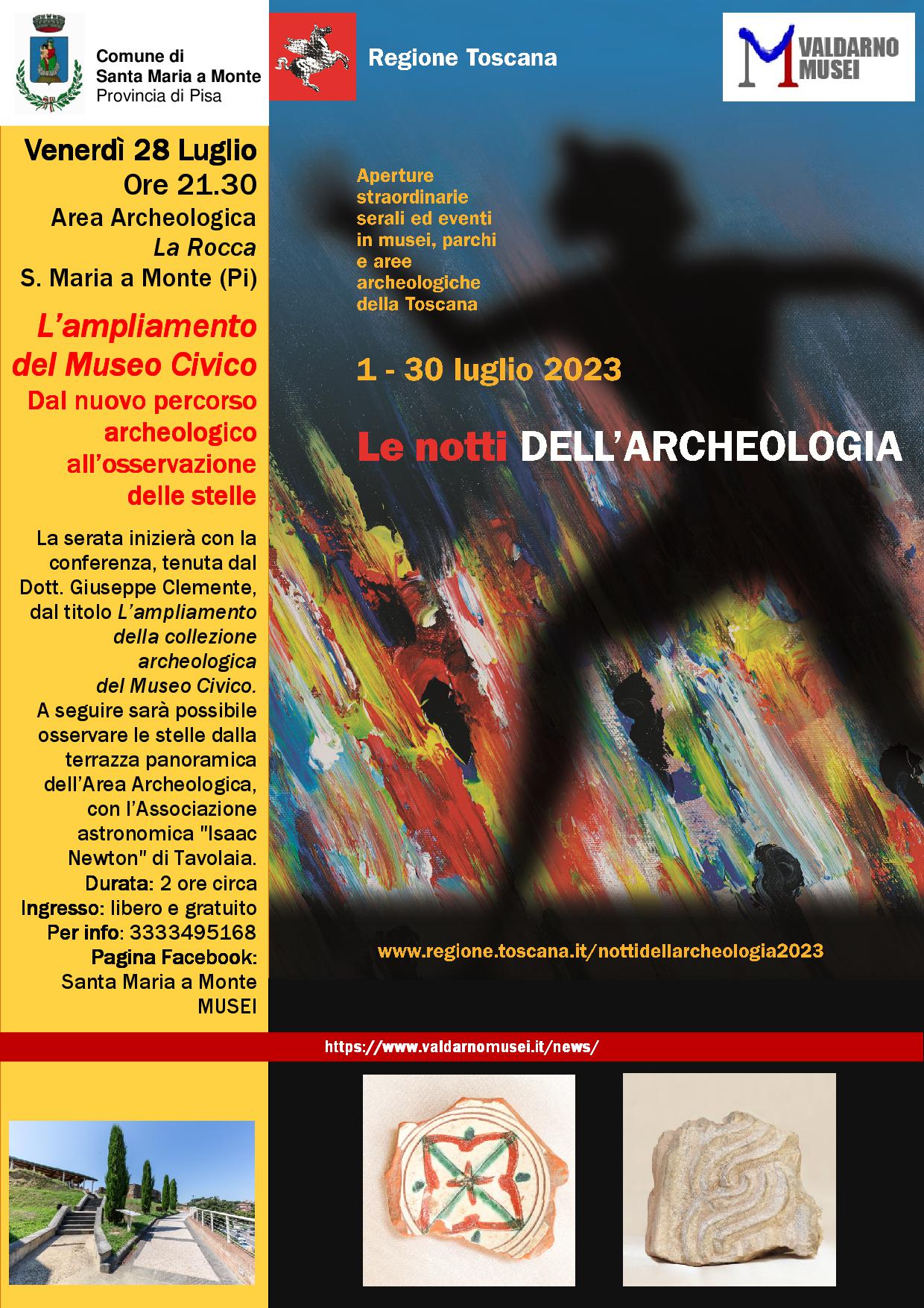 Il Sindaco Manuela Del Grande comunica che Venerdì 28 Luglio ore 21.30, presso l’Area Archeologica La Rocca di Santa Maria a Monte, ci sarà una serata dedicata all’archeologia, nella quale verrà riferito del potenziamento della collezione archeologica del Museo Civico “Beata Diana Giuntini”.