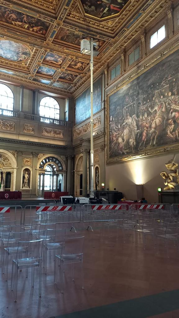 Pubblicato il 26 Luglio 2023 alle 576 × 1024 in Al via il monitoraggio del soffitto del Salone dei Cinquecento, restauratori a venti metri sfiorano gli affreschi vasariani