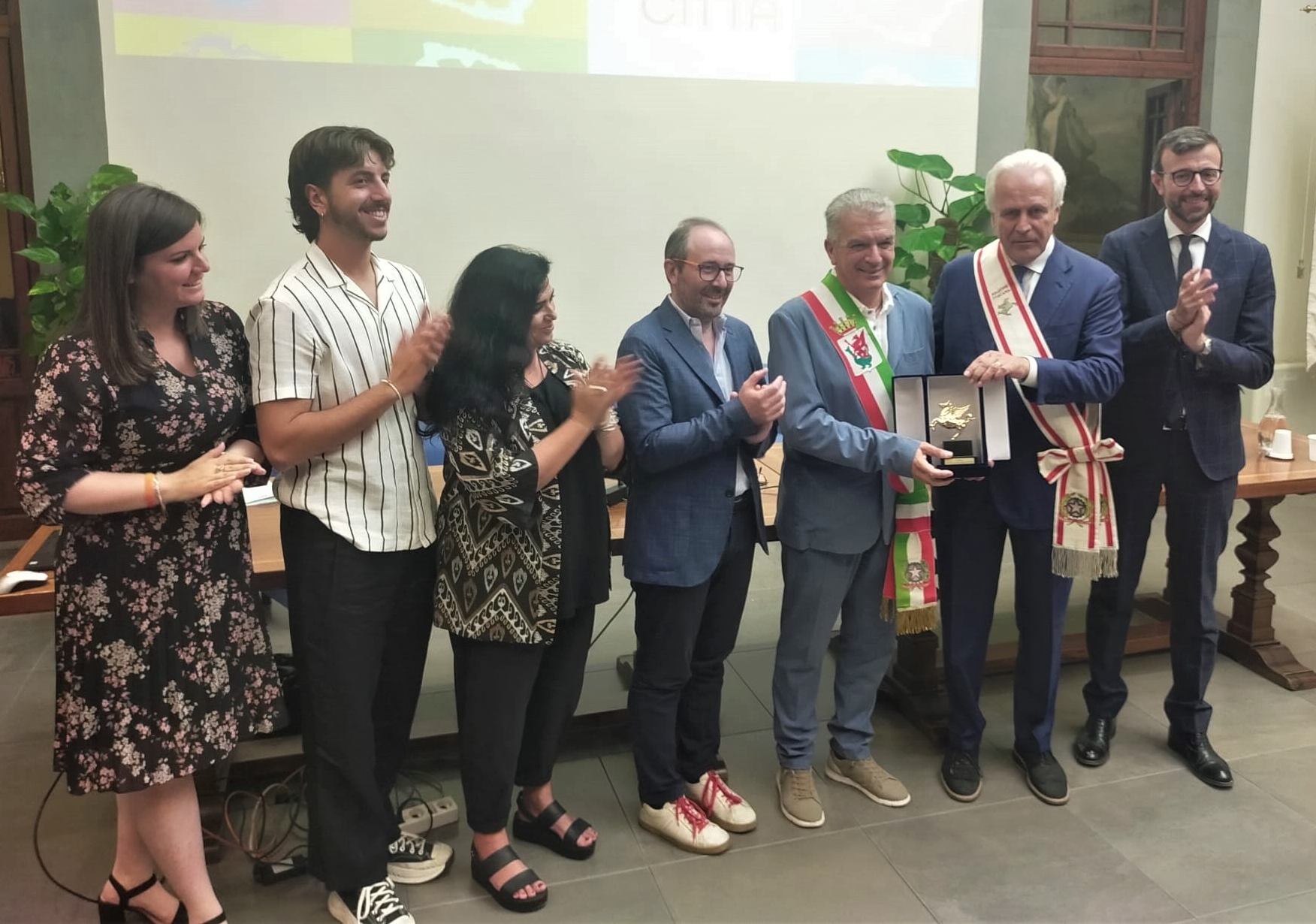 Il Pegaso d’oro alla città di Volterra. Lo ha conferito questa mattina il presidente Eugenio Giani al sindaco di Volterra Giacomo Santi, intervenuto in Palazzo Strozzi Sacrati insieme all’assessore alla cultura Dario Danti. Con il presidente Giani, il presidente del Consiglio regionale Antonio Mazzeo. In prima fila, il direttore di Volterra22 Paolo Verri, e la project manager di Volterra22, Cinzia De Felice.