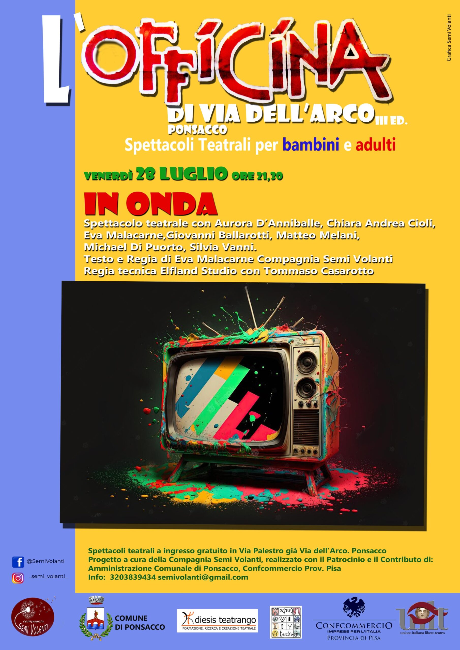 Venerdì 28 Luglio andrà in scena l’ultimo appuntamento della rassegna Teatrale de L’Officina di via dell’Arco, “IN ONDA”: uno spettacolo teatrale sulla televisione e i personaggi che la popolano; comico, irriverente, profondamente attuale.