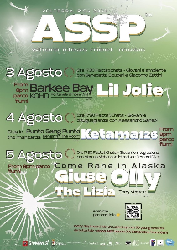 Il 3 agosto segna l'inizio dell'Impact Lab, un workshop che riunirà 50 giovani attivisti provenienti da tutta Italia: un’occasione unica e stimolante per condividere idee, competenze e strategie per promuovere un network di giovani attivisti. Nel pomeriggio alle 17.30, nella suggestiva Piazza XX Settembre, ogni giorno prenderanno il via i Facts&Chats, coordinati e moderati da Factanza con Giunio Panarelli, con un primo incontro sul tema "Giovani e Ambiente", che vedrà la partecipazione di Benedetta Scuderi, esperta in politiche verdi, e Giacomo Zattini, portavoce di Fridays for Future. La serata culminerà con concerti nel Parco Fiumi, con apertura cancelli dalle 20, dove artisti emergenti come Lil Jolie, Barkee e Fontanella Empire Vinile regaleranno emozioni indimenticabili.