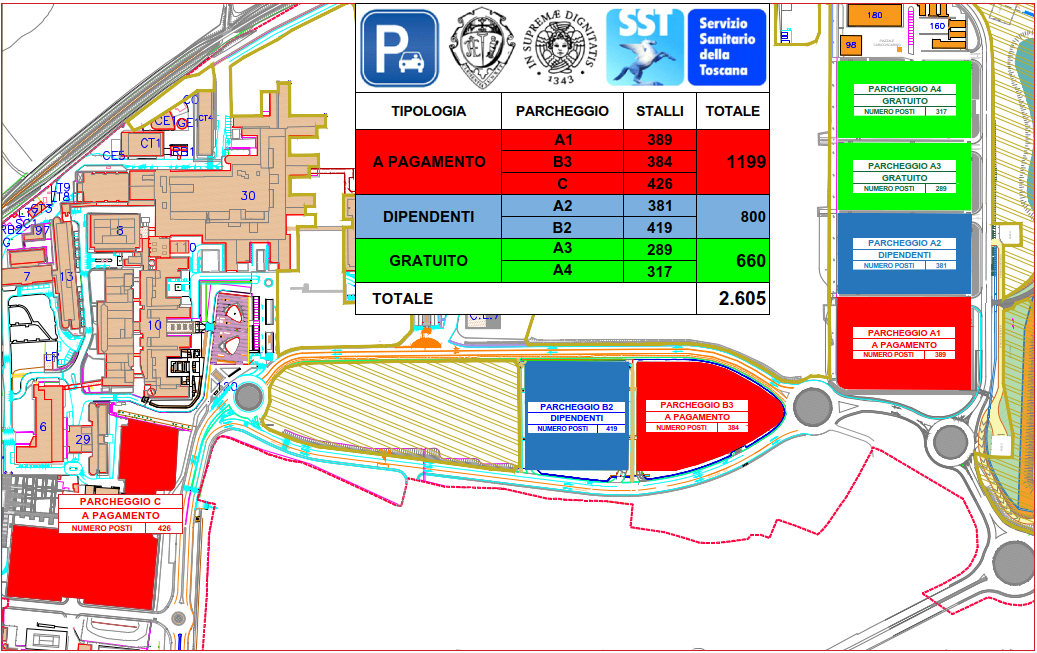 Attualmente, in attesa della realizzazione del parcheggio B1, il numero complessivo degli stalli ammonta a 2605, di cui 1199 a pagamento, 800 a uso esclusivo dei dipendenti e 660 gratuiti.