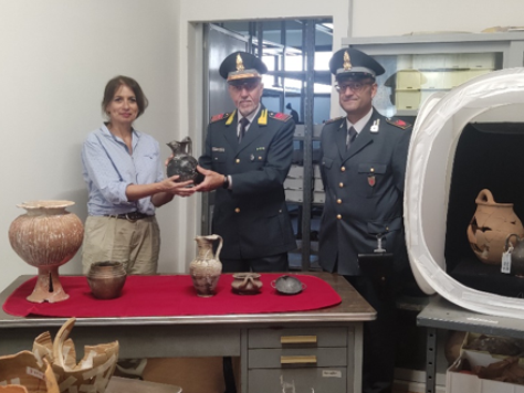 Nello specifico i reperti sono classificati come Oinochoe (brocca di vino) in Bucchero, tipologia di ceramica nera e lucida, Oinochoe in ceramica d'impasto a bocca trilobata, Holmos (vaso su alto piede) in ceramica d'impasto rosso e ancora Kylix (coppa per il vino) in Bucchero, Olla Biconica (recipiente in terracotta destinato alla cottura o conservazione dei cibi) e tazza attingitoio. Per il titolare dell'azienda che deteneva i beni archeologici è scattata la segnalazione alla Procura della Repubblica di Arezzo per ricettazione di beni culturali provenienti da reato. Come spiegato ancora dalla guardia di finanza, all'esito delle indagini il tribunale di Arezzo ha emesso sentenza di condanna e disposto la confisca, con la quale i beni vincolati sono stati espropriati a favore del patrimonio dello Stato, con la devoluzione alla Soprintendenza Archeologica, Belle Arti e Paesaggio delle province di Siena, Grosseto e Arezzo.