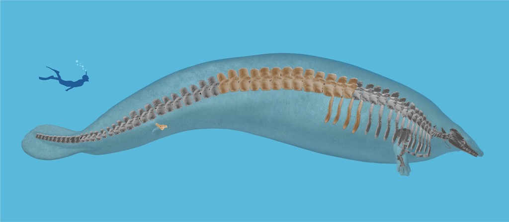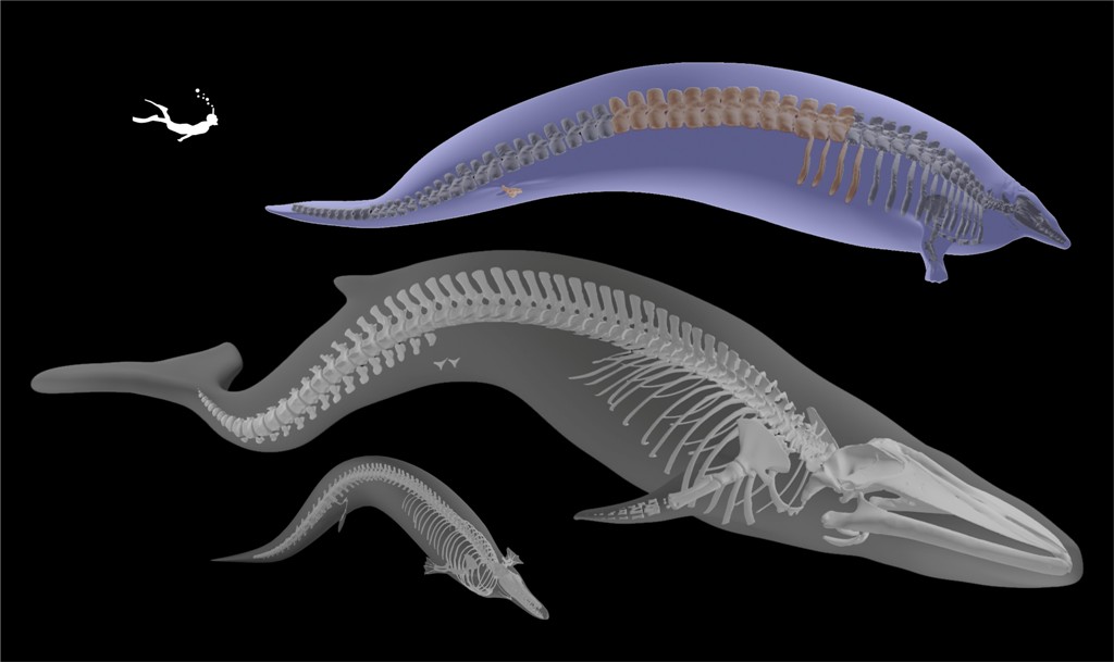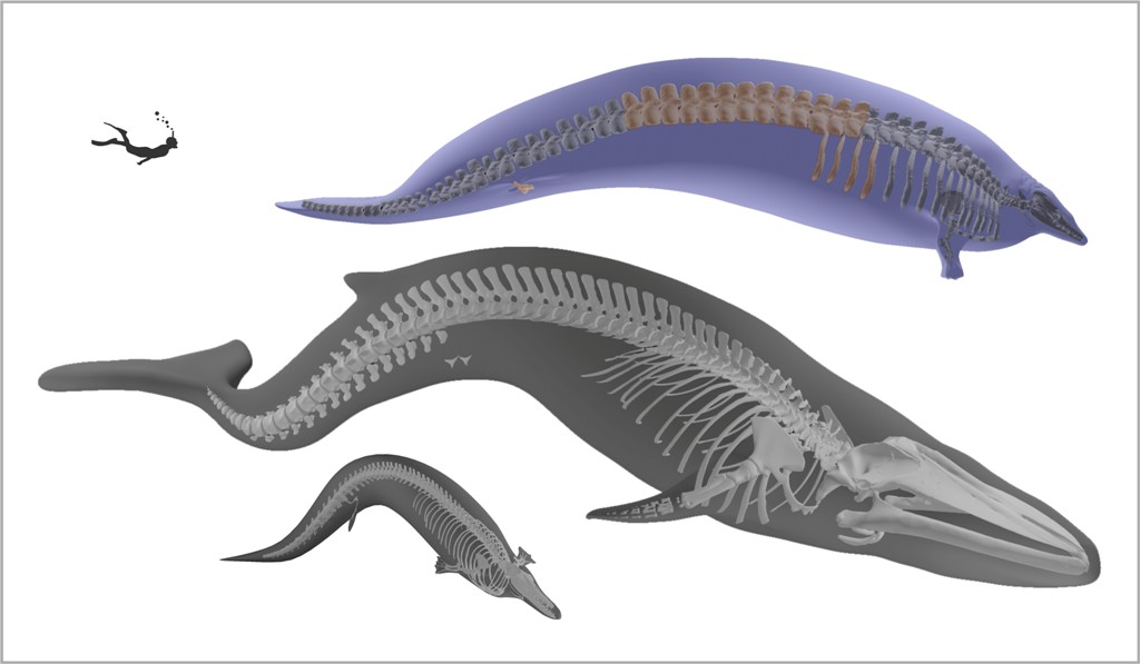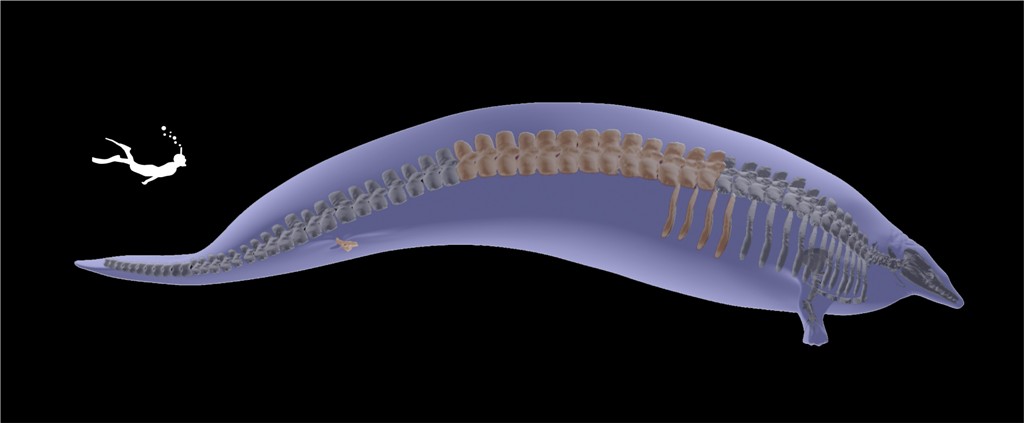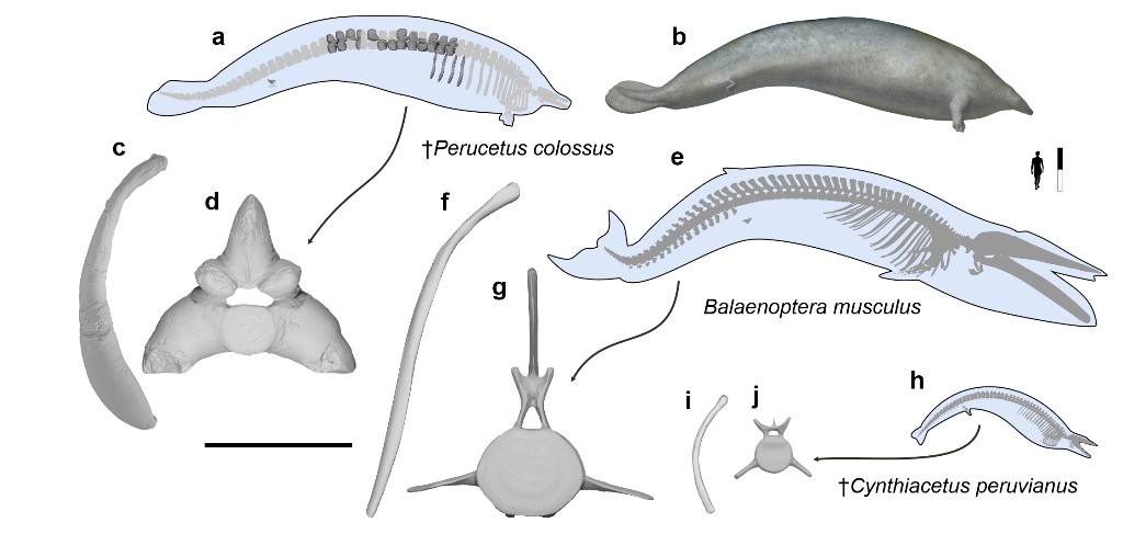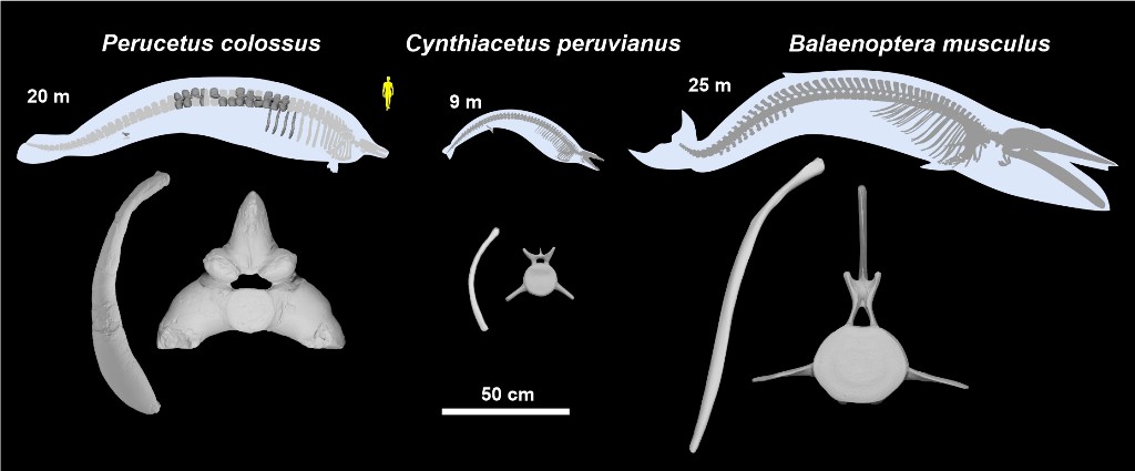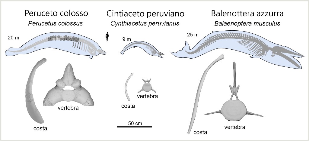 Le ossa fossili di questo cetaceo primitivo sono state recuperate in successive campagne di scavo e sono ora conservate presso il Museo di Storia Naturale di Lima. Consistono di tredici vertebre, quattro costole e parte del bacino, quest’ultimo a indicare che Perucetus era ancora provvisto di piccole zampe posteriori, una condizione riscontrata anche negli altri Basilosauridi, il gruppo di cetacei arcaici a cui è stato riferito questo nuovo mostro marino. “Sebbene lo scheletro da noi studiato non sia completo, stime rigorose basate sulla misurazione delle ossa conservate e sulla comparazione con un ampio database di organismi attuali e fossili – spiega Giovanni Bianucci – indicano che la massa scheletrica di Perucetus era di circa 5-8 tonnellate, un valore perlomeno doppio rispetto alla massa scheletrica del più grande animale vivente, la balenottera azzurra. Il pesantissimo scheletro di Perucetus, che in vita avrebbe raggiunto i 20 metri di lunghezza, suggerisce che la massa corporea di questo antico cetaceo potesse raggiungere le 340 tonnellate, quasi il doppio della più grande balenottera azzurra e oltre quattro volte quanto stimato per l’Argentinosauro, uno dei più grandi dinosauri mai rinvenuti”. Perucetus rappresenta dunque un ottimo candidato al ruolo di animale più pesante di tutti i tempi, un record da cui verrebbe scalzata proprio la balenottera azzurra. Le implicazioni paleobiologiche di una simile scoperta sono di estrema importanza. “L’enorme massa corporea di Perucetus – prosegue Bianucci – indica che i cetacei sono stati protagonisti di fenomeni di gigantismo in almeno due fasi: in tempi relativamente recenti, con l’evoluzione delle grandi balene e balenottere che popolano gli oceani moderni, e circa 40 milioni di anni fa, con la radiazione dei Basilosauridi di cui Perucetus è il rappresentante più straordinario”.