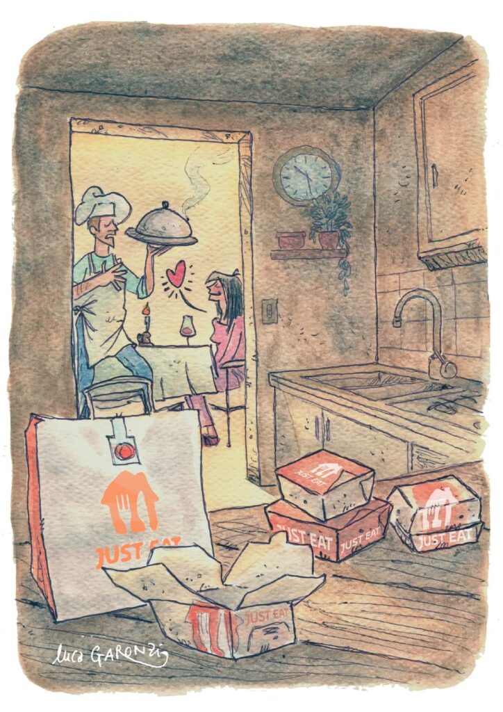 Il veronese Luca Garonzi ha trionfato nella sezione italiana che come tema aveva “le Bugie tra i fornelli”. Lui l’ha risolta con la tenera vignetta di un giovane che per amore si finge cuoco anche se ha ordinato tutta la cena su Just it.