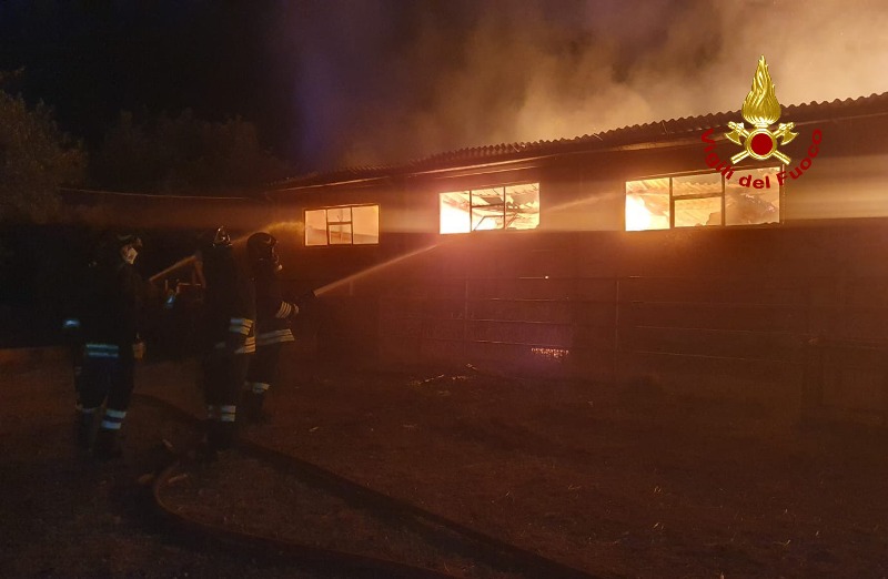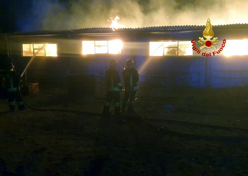 La struttura coinvolta dalle fiamme, di circa 300 metri quadrati, conteneva rotoballe di fieno, paglia e alcune attrezzature agricole. Nessuna persona e nessun animale sono rimasti coinvolti. L'intervento è ancora in corso.