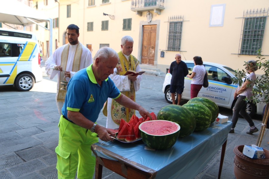 Bellissima e partecipata la consueta "Festa di San Rocco", co-patrono della Misericordia di San Casciano in Val di Pesa. Dopo la celebrazione della Messa alle ore 8.30 nella Chiesa dell'Arciconfraternita, celebrata da don Massimiliano Gori, insieme con il vice parroco don Marco Tognaccini e la benedizione dei cocomeri tagliati dal decano Vasco Cinelli, è iniziato il momento conviviale.