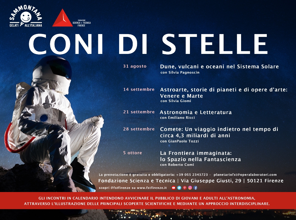(Giovedì 28 settembre) Comete: Un viaggio indietro nel tempo di circa 4,3 miliardi di anni, grazie a GianPaolo Tozzi, fisico con specializzazione in astrofisica sarà possibile scoprire le comete e la loro storia primordiale nel Sistema Solare che consente di ottenere informazioni preziose sulle condizioni chimiche e fisiche durante la formazione del sistema Solare. (Giovedì 5 ottobre) La Frontiera immaginata: lo Spazio nella Fantascienza, è il titolo dell’incontro a cura di Roberto Comi, Presidente dell’Associazione Amici dell’Osservatorio Polifunzionale del Chianti da sempre attento alla divulgazione scientifica. Lo spazio, topos classico della fantascienza, tanto da segnarne la nascita sarà al centro dell’ultimo appuntamento durante il quale verranno illustrati alcuni esempi di come questo tema è stato trattato nella letteratura di genere, con incursioni nei mondi del cinema e dei fumetti. Grazie a Sammontana, sponsor tecnico dell’evento, al termine degli incontri i partecipanti riceveranno un cono “Cinque stelle”, in tema con le attività del Planetario.