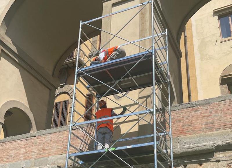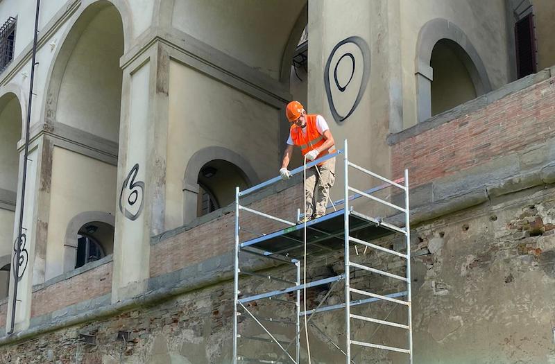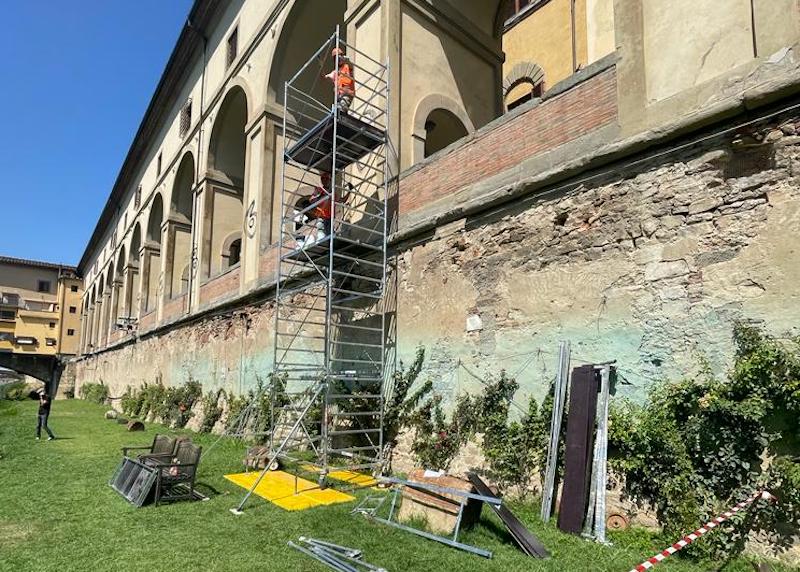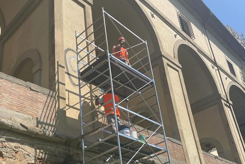 In seguito alla conclusione degli accertamenti condotti dai Carabinieri, le Gallerie degli Uffizi hanno dato il via stamattina alle operazioni di ripulitura e ripristino della superficie dei pilastri del Corridoio Vasariano, vandalizzato ieri notte e imbrattato con la scritta DKS 1860. I lavori, seguiti direttamente dagli architetti del complesso museale, dureranno alcuni giorni. “Circa 10.000 euro" l’ammontare della spesa per riparare il danno arrecato al monumento, calcolano i tecnici delle Gallerie degli Uffizi: "Ci costituiremo parte civile - spiega il direttore Eike Schmidt - e chiederemo ai responsabili non solo questa somma, ma in base al Codice Urbani anche il danno per la pubblicità non autorizzata di un marchio commerciale, quello della scritta, quantificabile in base al mercato in una cifra fino a ulteriori 100mila euro. Non importa in questo contesto se gli imbrattatori abbiano agito o meno in nome del marchio che cercavano di promuovere".