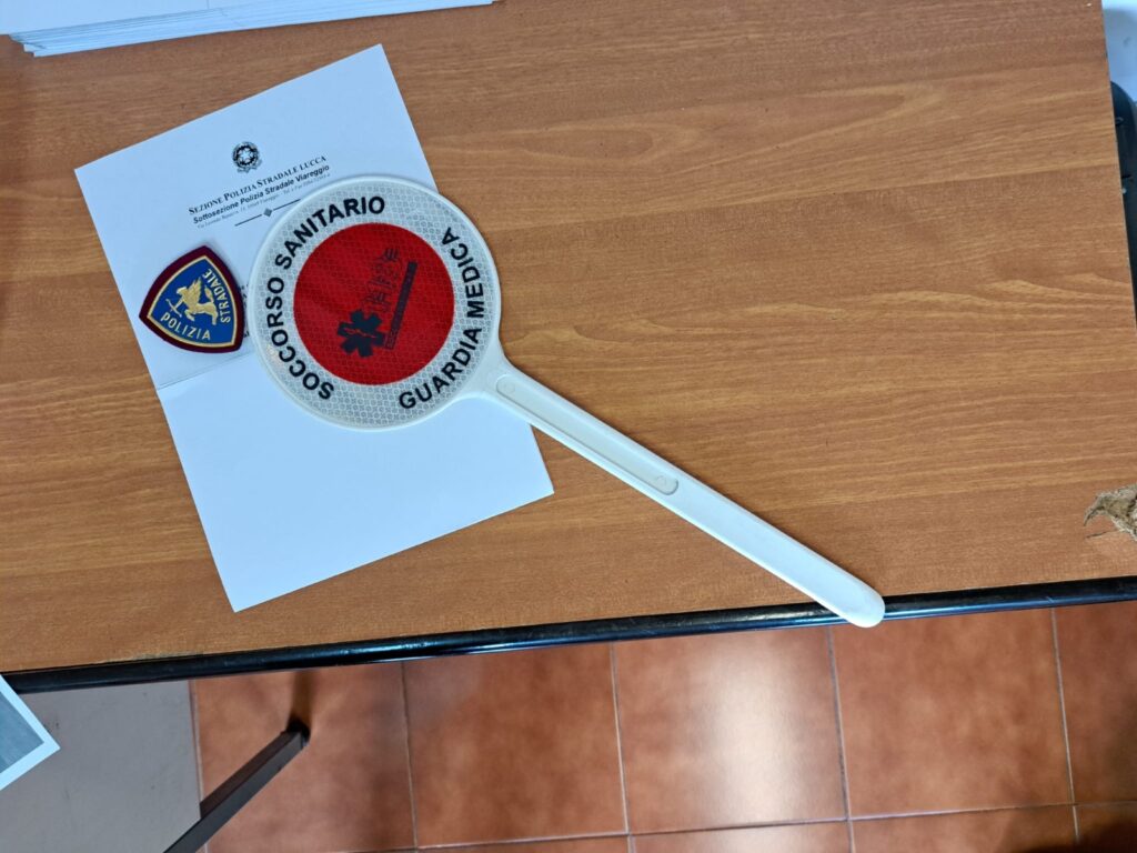 Alla richiesta di spiegazioni dei colleghi della Polstrada di Viareggio, giunti sul posto, il giovane cercava di farsi passare per paramedico della croce rossa di Genova, dando giustificazioni poco chiare: così, il giovane è stato denunciato, poiché in possesso di un illecito segno distintivo di identificazione in uso ai corpi di Polizia.