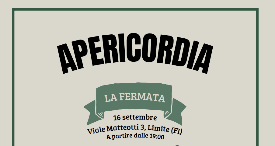 Più che un aperitivo, a Limite c'è l'Apericordia. La crasi è con Misericordia, l'evento è organizzato dall'associazione giovanile di volontariato e aula studio "La Fermata" che fa capo alla Misericordia di Limite sull'Arno. Presso la sede in Via Giuntini 3/5, Limite, sabato 16 settembre si terrà proprio l'Apericordia, una serata con musica.