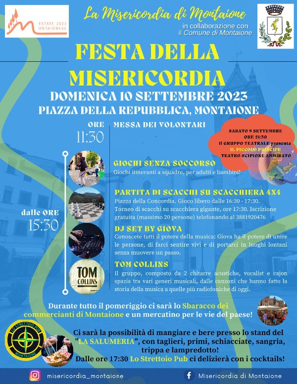 Misericordia di Montaione in festa nel weekend di sabato 9 e domenica 10 settembre 2023. In programma giochi, musica, cibo e molto altro. Alla vigilia della festa, sabato 9, appuntamento al teatro Scipione Ammirato alle ore 21.30 dove i piccoli attori in gioco della Misericordia di Montaione presenteranno "Il Piccolo Principe".