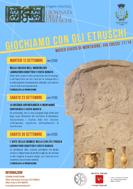 Il Comune di Montaione aderisce anche quest’anno alla rassegna promossa dal Consiglio Regionale della Regione Toscana denominata Giornata degli Etruschi 2023, all’interno della quale vengono organizzati eventi volti alla valorizzazione della civiltà, della cultura e del patrimonio etrusco della Toscana. Montaione vanta molteplici tracce delle sue origini etrusche, quindi è stato organizzato un programma dal titolo Giochiamo con gli Etruschi con tre appuntamenti nel mese di settembre, che ha ottenuto il cofinanziamento dallo stesso Consiglio Regionale. Tutti gli eventi si terranno presso il Museo civico archeologico che si trova nel centro storico in Via Cresci 17-19 e saranno realizzati in collaborazione con l’Associazione Archeologica della Valdelsa Fiorentina.