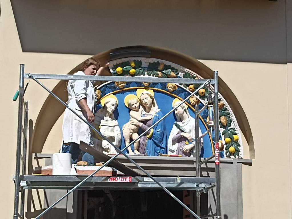 Mercoledì 6 settembre 2023 è stata composta sopra il portone di accesso all’ex convento di Sant’Orsola, a Firenze, una copia della lunetta originale della robbiana raffigurante la Madonna con Bambino fra San Francesco d’Assisi e Sant’Orsola.