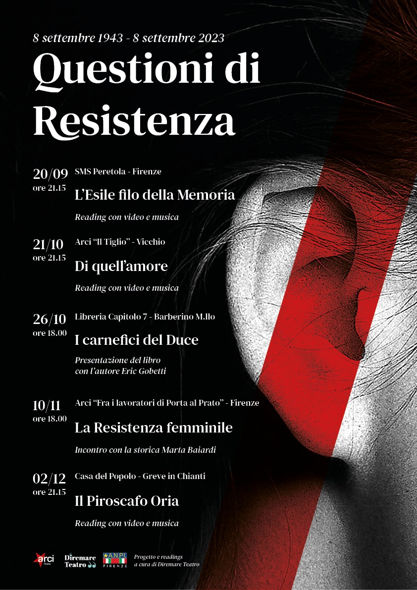QUESTIONI DI RESISTENZA - La terza iniziativa nel contesto di “80 Anni Antifascisti” sarà la rassegna “Questioni di Resistenza” a cura di Diremare Teatro. Cinque diversi appuntamenti in quattro Case del Popolo di Firenze e provincia e in una libreria. L’idea di base è quella di riflettere sulle conseguenze delle scelte compiute all’indomani dell’8 settembre 1943, che hanno cambiato la scena politica italiana ed europea, fino alla sconfitta degli eserciti dell’Alleanza dell’Asse e alla liberazione dal nazifascismo. Attraverso 3 readings si parlerà di Resistenza e lotta partigiana, della difficoltà di reinserimento nella società dei reduci dei campi di sterminio e della questione degli IMI, i militari italiani deportati nei campi di concentramento perché si erano rifiutati di aderire alla Repubblica di Salò.